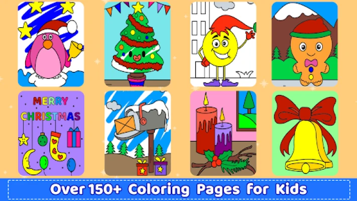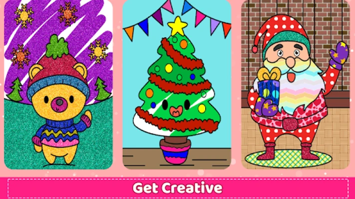 Lihtsad juhtnupud muudavad kritseldamise, maalimise ja joonistamise imelihtsaks ja lõbusaks. Kasutage kauneid värve, mustreid ja sädelusi, et luua unikaalseid kunstiteoseid. Väikesed kunstnikud saavad vabalt katsetada, samas kui vanemad kasutajad saavad nautida piiridesse värvimise täpsust. Rakendus ei vaja internetiühendust, pakkudes meelelahutust igal ajal ja igas kohas. Lisaks loomingulisele poolele leiate ka mälumängu, et panna proovile oma mälu. Jagage oma imelisi loominguid pere ja sõpradega sotsiaalmeedias ning nautige koos pühadeaega täis värve ja rõõmu.