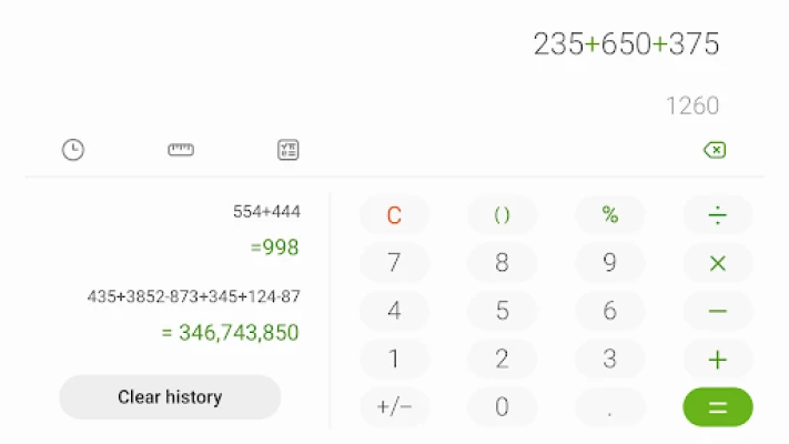 Samsungi kalkulaator teostab põhilisi ja keerukamaid insenertehnilisi arvutusi. See võimaldab mugavalt vaadata arvutusajalugu ja kasutada eelmisi valemeid. Lisaks saad kiirelt teisendada erinevaid ühikuid, nagu pindala, pikkus ja temperatuur.